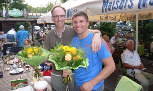Teilnehmer und Helfer versammelten sich anschließend auf der großräumigen Terrasse der „Scheune“ am S-Bhf Grunewald, wo Wettkampfleiter Günter die amtlichen Ergebnisse der Vereinsmeisterschaft 2013 bekannt gab. Unter dem Beifall aller anwesenden Mitglieder nahmen der neue Vereinsmeister Holger Stube sowie Vizemeister Alexander Bößwetter und Liman Begolli einen bunten Siegerstrauß sowie die herzlichsten Glückwünsche ihrer Vereinskameraden entgegen.