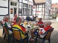 Dass unsere eingespielte Gruppe wie jeden Tag die ausgeschilderte Strecke zur Aufnahme ihrer täglichen Sonderverpflegung verließ, überraschte unsere zwei fremden Mitfahrer: Während die Möwe Karl das Weite suchte, um auf die offizielle Strecke zurückzukehren, war der Fahrer vom MTV Altlandsberg von der Idee einer spontanen Einkehr sofort begeistert. Vor dem urigen Café Kaffeepause in Sendenhorst, das in einem alten Fachwerkhaus mit altertümlicher Einrichtung untergebracht ist, ließen wir es uns bei leckeren Kuchen und passenden Getränken gut gehen. Von diesem Augenblick an, konnte uns auf der Strecke zurück nach Werne - bis auf einen geschlossenen Bahnübergang - nichts mehr aufhalten.