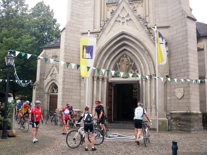 Auch heute hat der Wettergott ein Einsehen mit uns: Die Nacht überall Unwetter mit Starkregen, aber morgens trocken, auch wenn es ziemlich düster aussah. Die vorgesehene Strecke führte fast ausschließlich über Wirtschaftswege, die allerdings noch die Folgen der nächtlichen Unwetter zeigten, nämlich Steine und Schmutz, der von den Feldern auf die Wege gespült wurde. Hinzu kamen unzählige Richtungsänderungen, die ein normales "Pedalieren" fast unmöglich machten. Ich kann mich nicht erinnern, jemals so viele Kurven gefahren zu sein. Der Tenor des Tages hieß: Abbremsen und wieder antreten. Ein Ausgleich bildeten allerdings die drei ausgesuchten Verpflegungspunkte, die uns doch Höhepunkte der Gegend zeigen sollten: Wasserschloss Hovestadt, die Basilika St. Ida sowie die stillgelegte Zeche Westfalen in Ahlen.