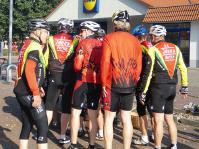 Nach ca. 31 km dann in Wandlitz die Pause. Hier standen unsere fleißigen Damen Renate, Ines und Manuela, die keine Mühe gescheut hatten und ein kleines Buffet mit Kuchen und anderen Verpflegungseinheiten aufgebaut hatten. Vielen Dank den Damen! Ja und als die zweite Gruppe dort eintraf, war man doch sehr erstaunt, dass die erste Gruppe dort das Feld noch nicht geräumt hatte. Immerhin waren das doch die vermeintlich viel Schnelleren, die hätten längst weg sein sollen. So ist das eben wenn man beim Tempomachen den richtigen Abzweig (s. o.) verpasst.