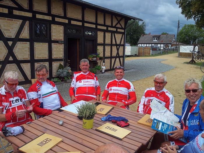 In Neuhardenberg trennte sich die große Gruppe, da Manuela und Günni wie auch die etwas weiter hinten fahrenden „E-Biker“ Manfred und Bernd dort einkehren wollten; die anderen fuhren weiter den drohenden dunklen Wolken entgegen bis nach Bollersdorf, um sich dort nach „getaner Arbeit“ im Gasthaus Fischer ein wenig zu stärken.