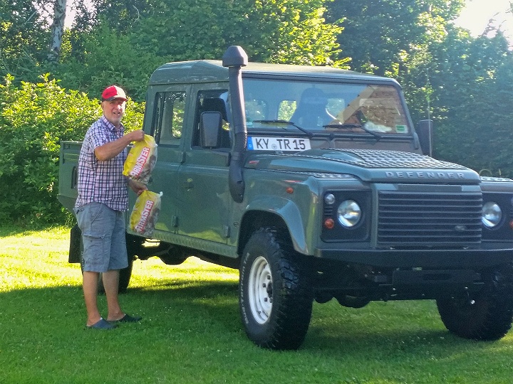 Beim Rundgang durch das Anwesen wurden die grasenden Schafe, der auf dem alten Stromverteiler sitzende Hausstorch und das Prunkstück des Hausherrn, sein neuer Landrover besichtigt. Alles passt zusammen und ist zukunftszugewandt.